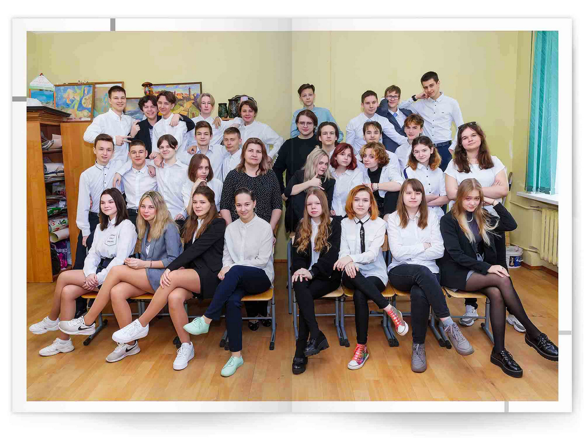 • Портреты всех одноклассников и все учителя, которые придут на съёмку на развороте