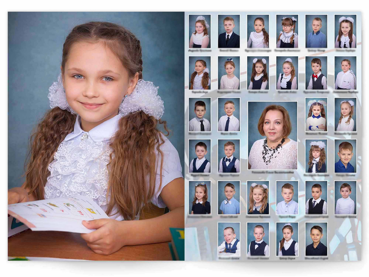 • Портреты всех одноклассников и все учителя, которые придут на съёмку на развороте