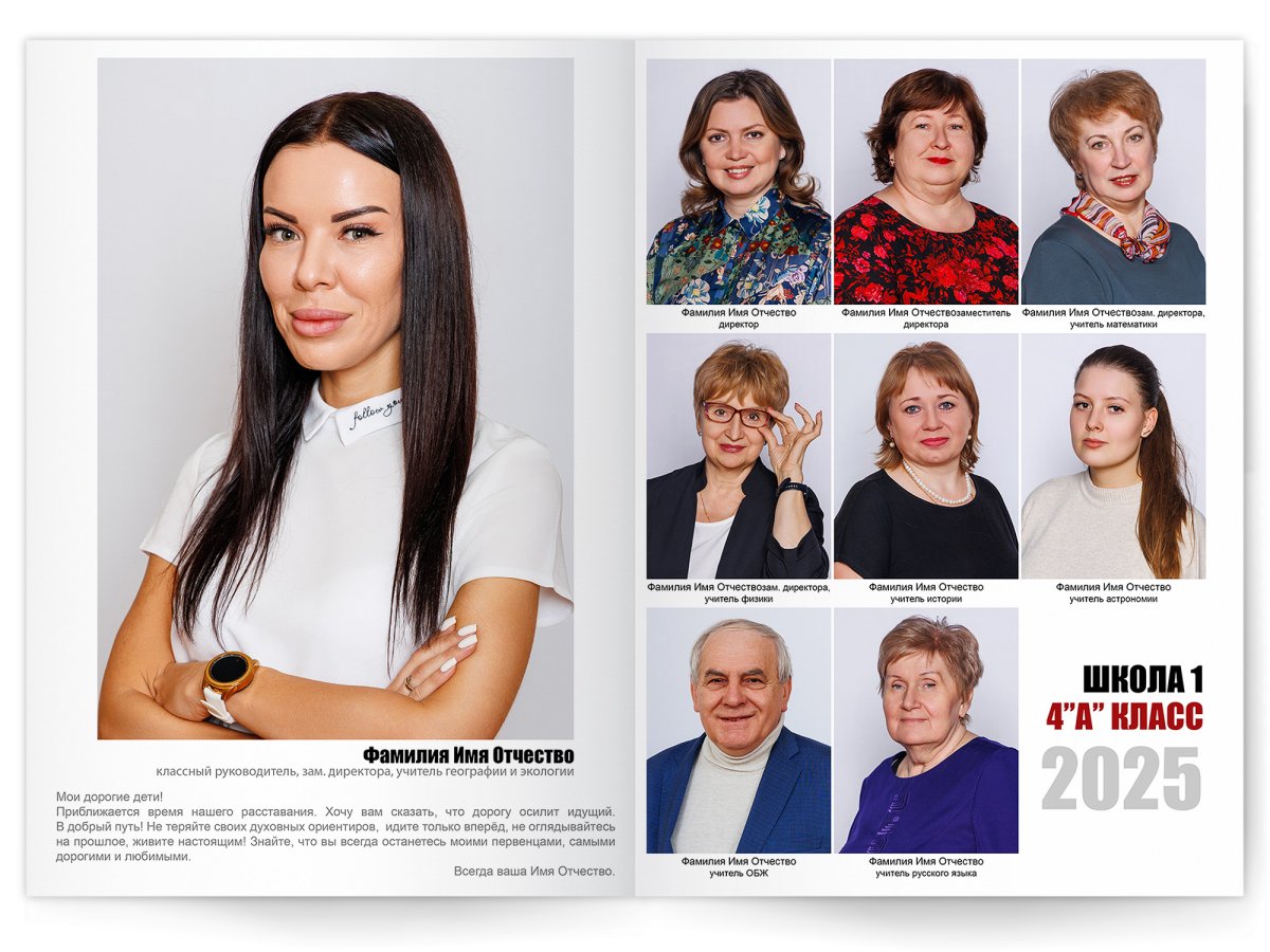 • Портреты всех одноклассников и все учителя, которые придут на съёмку на развороте