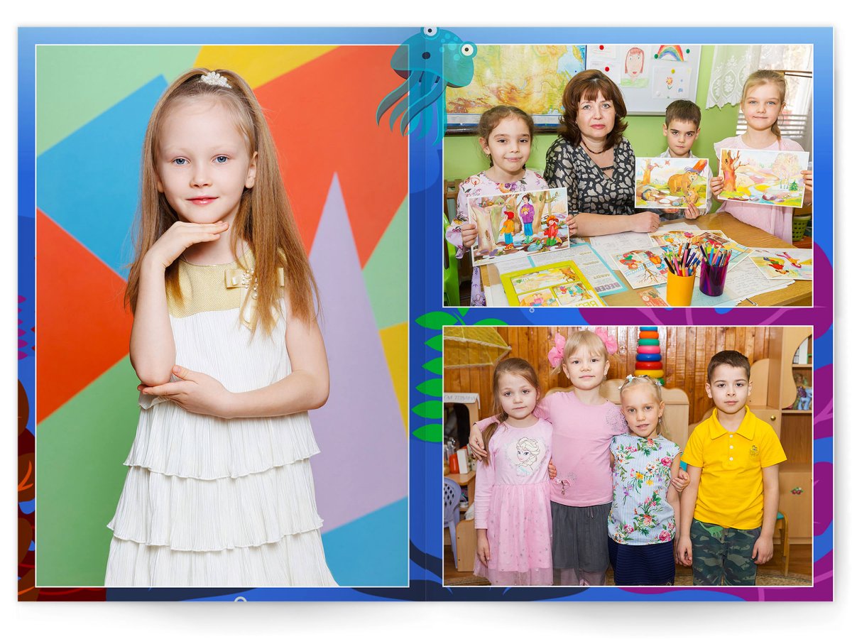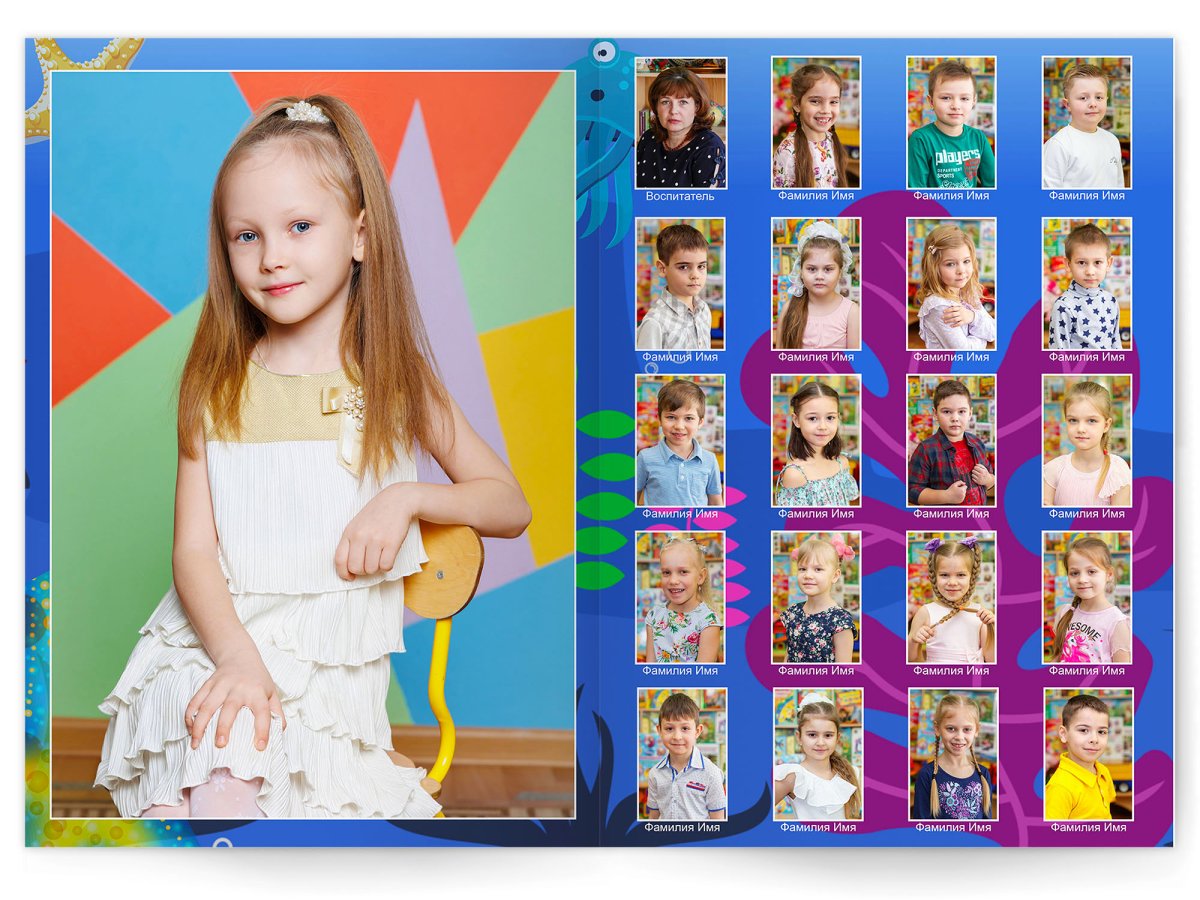 • Портреты всех детей и воспитателей на развороте